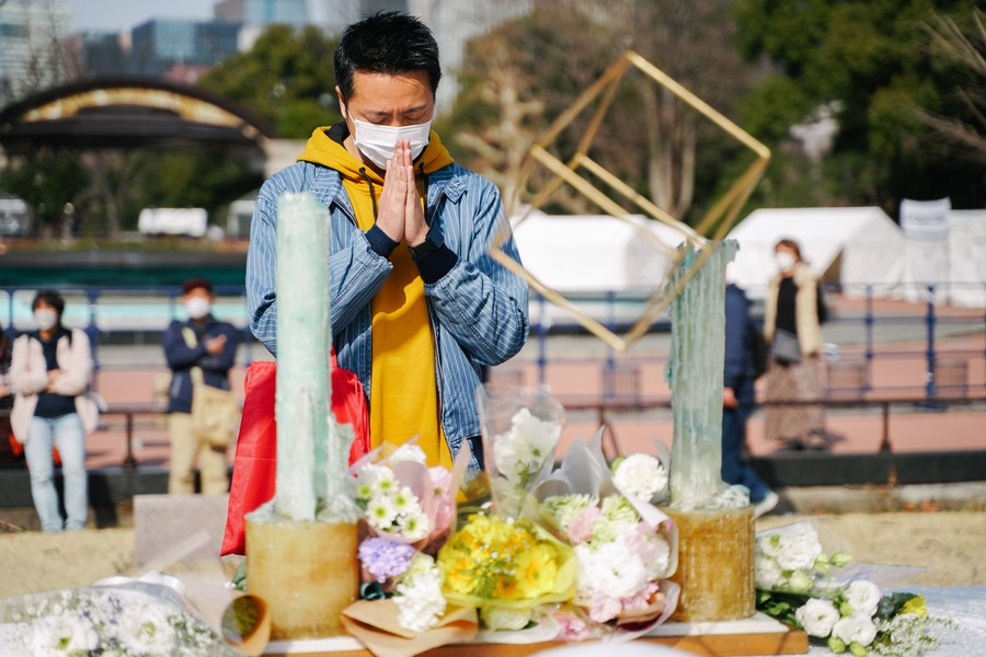 A man prays in front of a temporary altar at the Hibiya Park in Tokyo, Japan, on March 11, 2022 to commemorate the victims of a magnitude-9.0 earthquake and ensuing tsunami that hit Japan's northeast on March 11, 2011. (Xinhua/Zhang Xiaoyu)