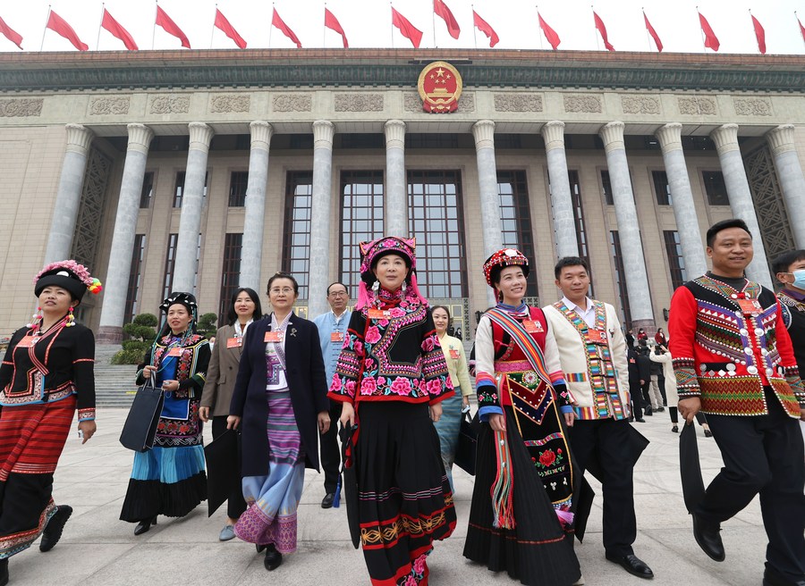 Deputies to the 13th National People's Congress (NPC) leave the Great Hall of the People after the closing meeting of the fifth session of the 13th NPC in Beijing, capital of China, March 11, 2022. (Xinhua/Jin Liwang)