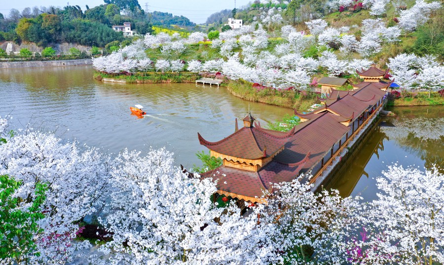 Aerial photo taken on March 10, 2022 shows cherry blossom in Danlin Town of Jiangyang District, Luzhou City, southwest China's Sichuan Province. (Photo by Liu Xueyi/Xinhua)