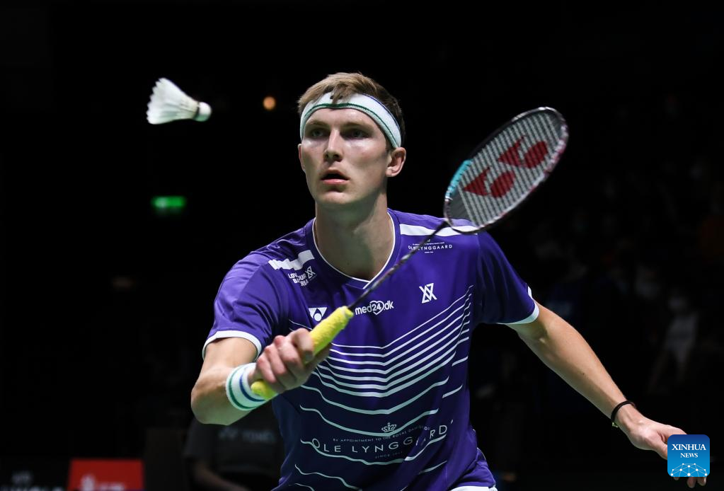 Viktor Axelsen of Denmark hits a return during the men's singles quarterfinal match against Srikanth Kidambi of India at the Yonex German Open 2022 badminton tournament in Muelheim, Germany, March 11, 2022. (Xinhua/Lu Yang)