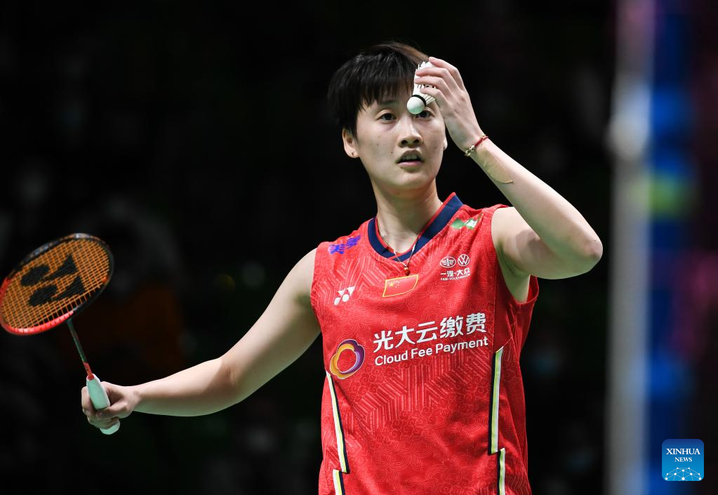 Chen Yufei of China competes during the women's singles quarterfinal match against Yvonne Li of Germany at the Yonex German Open 2022 badminton tournament in Muelheim, Germany, March 11, 2022. (Xinhua/Lu Yang)