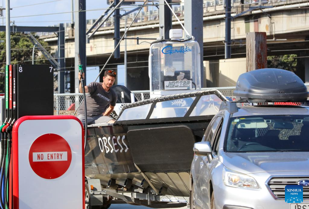A man fills in the tank of his boat a Waitomo gas station in New Zealand's capital city Wellington in the afternoon of March 11, 2022, moment before another hike of fuel price. Cars, boats and gallon bottles, New Zealanders were filling every tank with fuel before another big price hike tipped at the weekend. Petrol prices have already jumped up dramatically over the past month, which saw national average price of 91 petrol increase 11.8 percent to 2.94 New Zealand dollars per litre, and 23.1 percent increase for diesel to 2.28 New Zealand dollars per litre, according to the price comparing tool Gaspy. (Photo by Meng Tao/Xinhua)