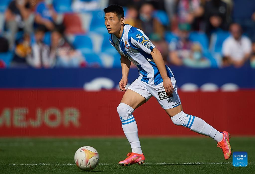 Espanyol's Wu Lei competes during a La Liga match between Levante UD and RCD Espanyol in Valencia, Spain, March 12, 2022. (Photo by Pablo Morano/Xinhua)