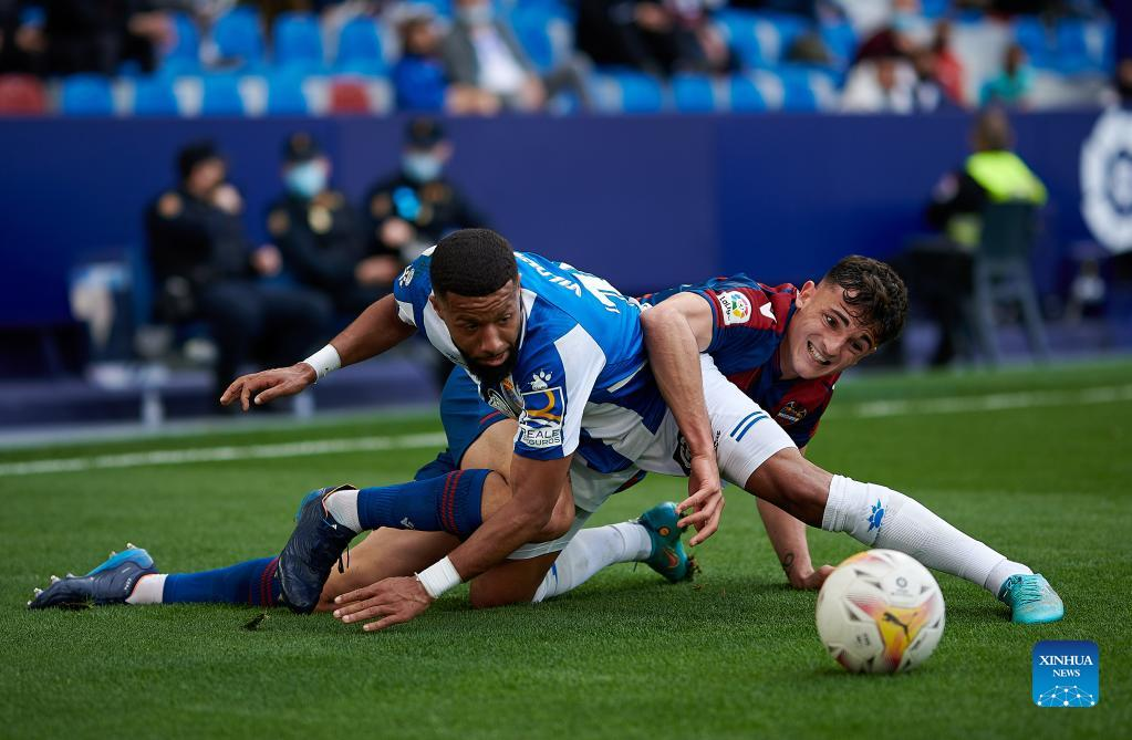 Espanyol's Adria Pedrosa (R) vies with Jorge de Frutos during a La Liga match between Levante UD and RCD Espanyol in Valencia, Spain, March 12, 2022. (Photo by Pablo Morano/Xinhua)