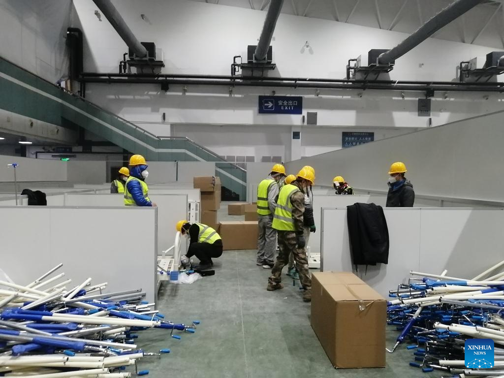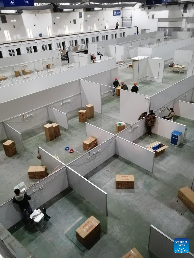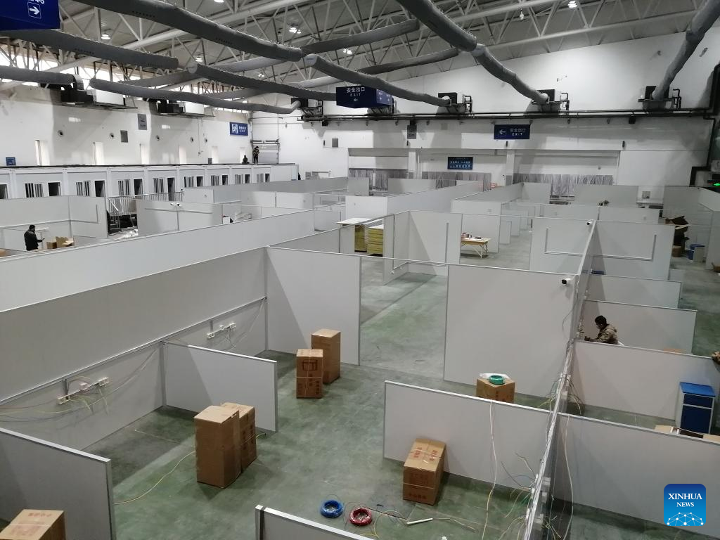 Workers are seen at a temporary hospital under construction at Changchun International Convention and Exhibition Center in Changchun, capital of northeast China's Jilin Province, March 12, 2022. With more than 1,500 beds, the temporary hospital at Changchun International Convention and Exhibition Center is under construction. Meanwhile, a temporary isolation site with more than 700 beds will also be set up in other pavilions near the temporary hospital. (Xinhua/Zhang Jian)