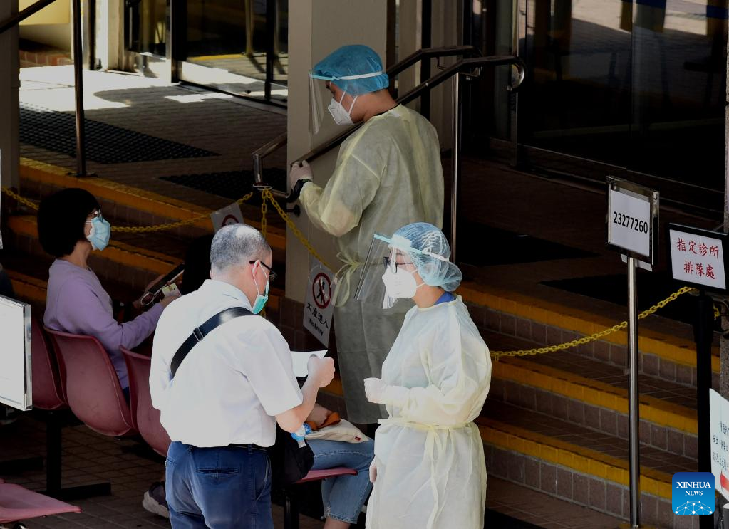 Medical workers guide citizens at a designated clinic in Hong Kong, south China, March 14, 2022. On Monday, Hong Kong registered 12,040 new COVID-19 cases by nucleic acid tests, and 14,868 additional positive cases through self-reported rapid antigen tests, official data showed. (Xinhua/Lo Ping Fai)