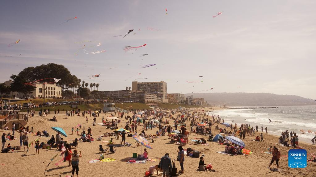 Photo taken on March 13, 2022 shows a view of the Redondo Beach's festival of the kite at the Redondo Beach in Los Angeles, California, the United States. Thousands of people on Sunday gathered at the Redondo Beach Pier in Los Angeles for its 48th Annual Festival of the Kite. (Photo by Zeng Hui/Xinhua)