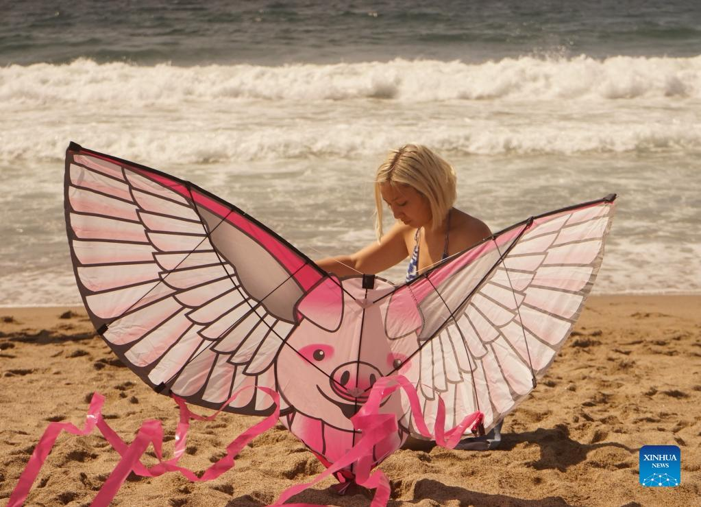 A woman prepares to fly a kite at the Redondo Beach in Los Angeles, California, the United States on March 13, 2022. Thousands of people on Sunday gathered at the Redondo Beach Pier in Los Angeles for its 48th Annual Festival of the Kite. (Photo by Zeng Hui/Xinhua)