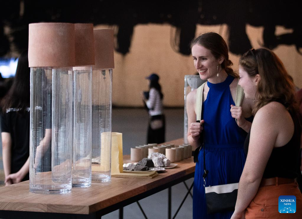 People visit Biennale of Sydney "rivus" at Art Gallery of New South Wales (NSW) in Sydney, Australia, on March 13, 2022. The 23rd Biennale of Sydney is held from March 12 to June 13, with more than 330 artworks by over 80 participants presented during the event. (Photo by Hu Jingchen/Xinhua)