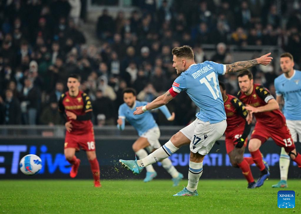 Lazio's Ciro Immobile (2nd R) shoots a penalty kick during a Serie A football match between Lazio and Venezia in Rome, Italy, March 14, 2022. (Photo by Alberto Lingria/Xinhua)