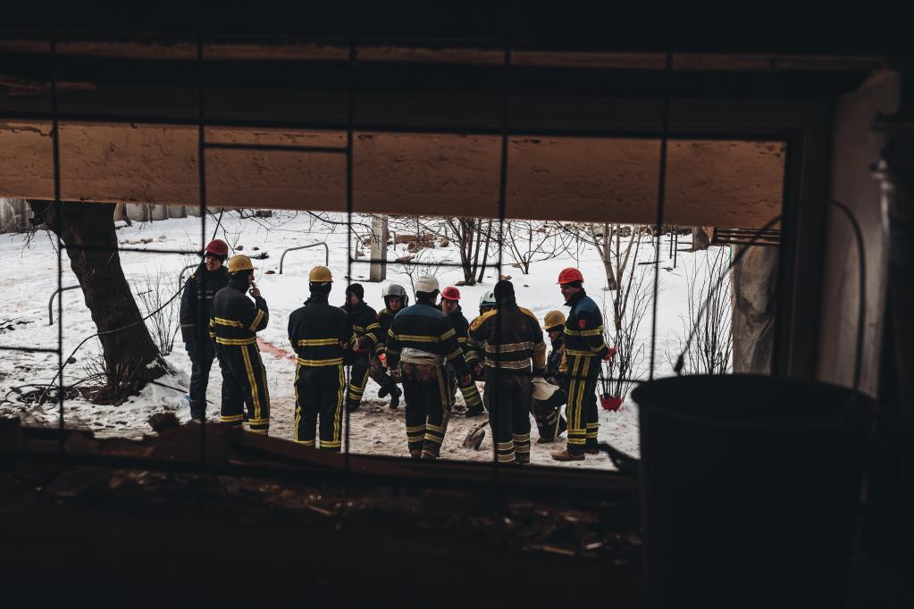 Firefighters work near a building in Kharkiv, Ukraine, March 13, 2022. (Photo by Diego Herrera/Xinhua)