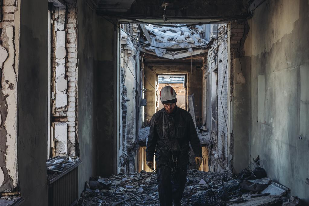 A firefighter works inside a building in Kharkiv, Ukraine, March 13, 2022. (Photo by Diego Herrera/Xinhua)