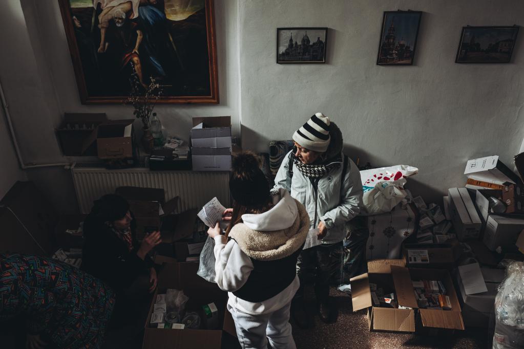 A woman receives medicine at a church in Kharkov, Ukraine, March 13, 2022. (Photo by Diego Herrera/Xinhua)