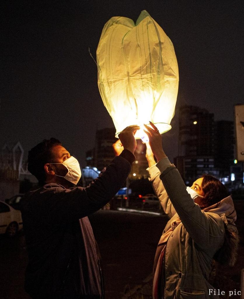 People release a wishing lantern in the celebrations of the Fire Festival in Tehran, Iran, on March 16, 2021.(Photo by Ahmad Halabisaz/Xinhua)