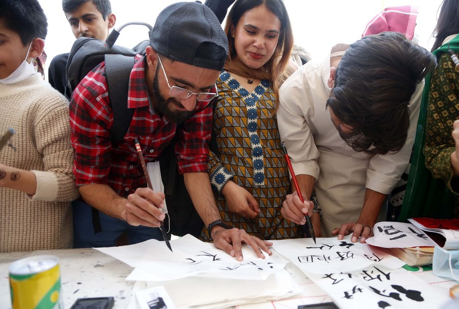 Students learn to write Chinese calligraphy during an international cultural festival at the National University of Modern Languages (NUML) in Islamabad, capital of Pakistan on March 14, 2022. (Xinhua/Ahmad Kamal)