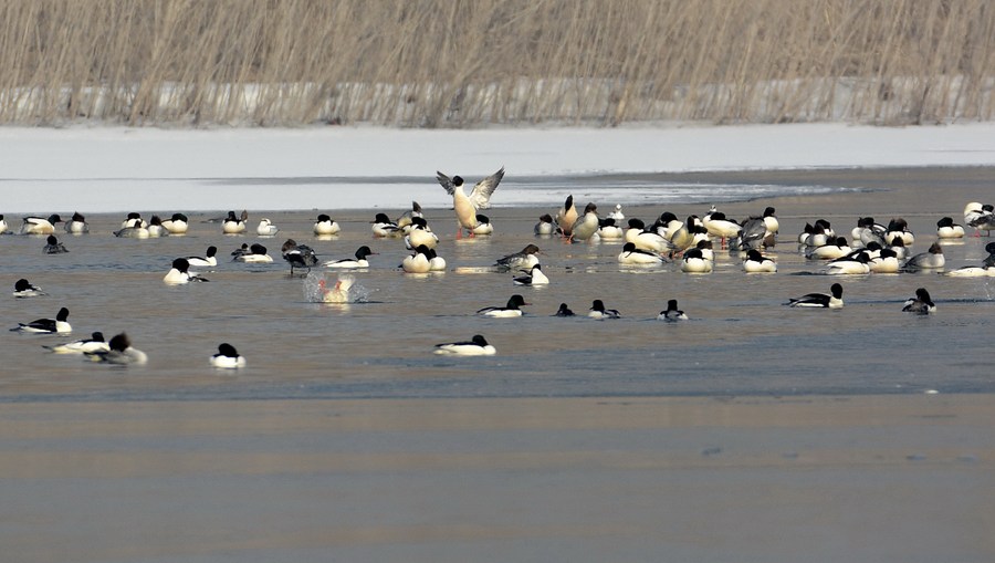 Birds frolic at the Yongding River in Beijing Garden Expo Park in Beijing, capital of China, Jan. 21, 2021. (Xinhua/Li Xin)