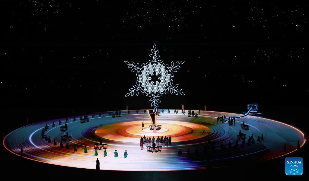 Ma Yifei (dressed in pink) plays the violin during the closing ceremony of the Beijing 2022 Paralympic Winter Games at the National Stadium in Beijing, capital of China, March 13, 2022.(Xinhua/Lan Hongguang)