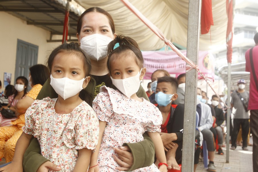 Children escorted by their parents wait for their first doses of China's Sinovac COVID-19 vaccines at an inoculation site in Phnom Penh, Cambodia on Feb. 23, 2022. (Photo by Phearum/Xinhua)