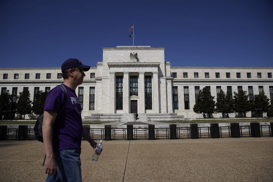 A man walks past the U.S. Federal Reserve in Washington, D.C., the United States, on March 16, 2022. (Photo by Ting Shen/Xinhua)