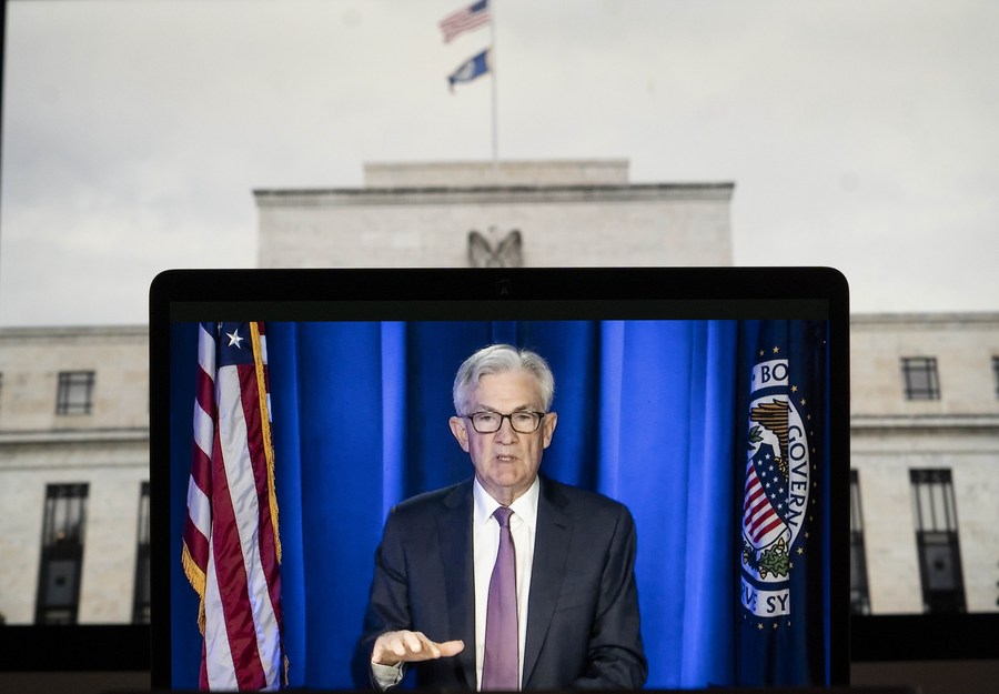 Photo taken in Arlington, the United States, on March 16, 2022 shows a screen displaying U.S. Federal Reserve Chairman Jerome Powell speaking during a virtual press conference. (Xinhua/Liu Jie)