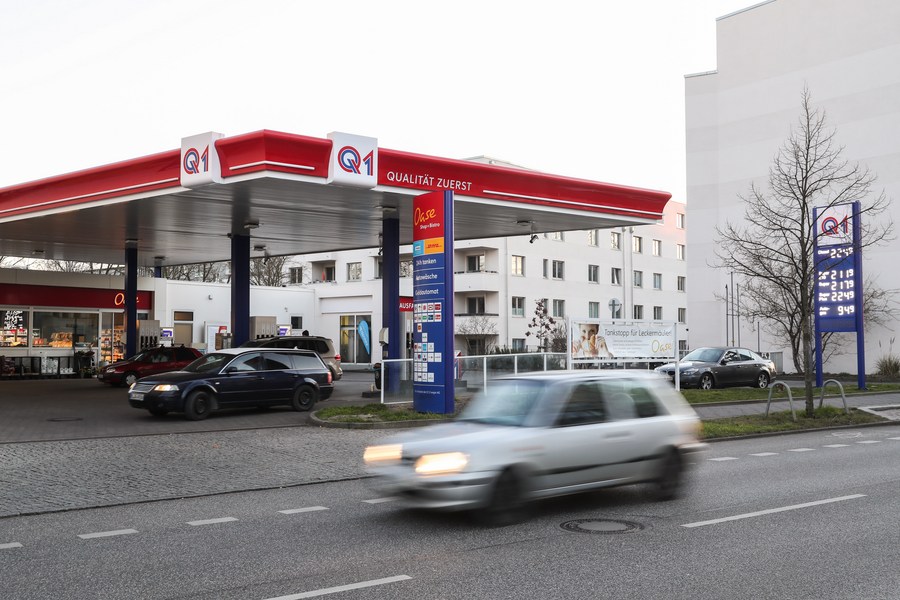 A vehicle runs past a gas station in Berlin, capital of Germany, March 11, 2022. (Xinhua/Shan Yuqi)