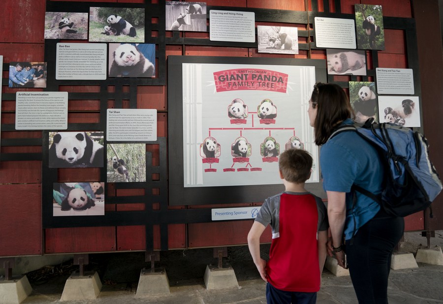 Visitors look at the giant panda family tree at Smithsonian's National Zoo in Washington, D.C., the United States, on March 16, 2022. (Xinhua/Liu Jie)
