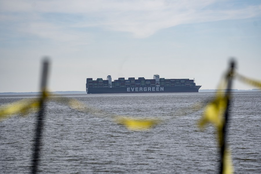 Photo taken on March 15, 2022 shows the container vessel Ever Forward in the Maryland portion of the Chesapeake Bay, the United States. (Xinhua/Liu Jie)