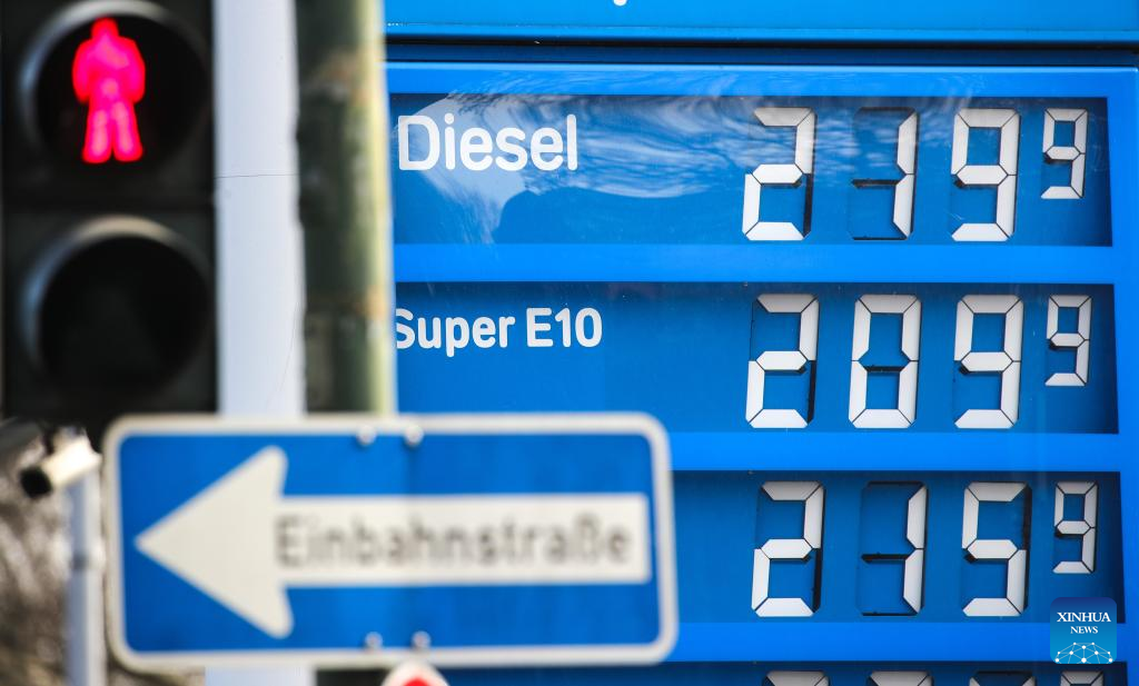 Photo taken on March 18, 2022 shows diesel and gasoline prices displayed on a board at a gas station in Frankfurt, Germany. Responding to the recent surge in petrol and diesel prices in Germany, the Federal Cartel Office (BKartA) said on Wednesday that it will closely monitor price developments at the country's gas stations. (Photo by Armando Babani/Xinhua)