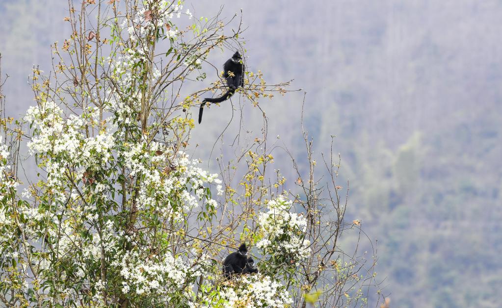 Francois' leaf monkeys are seen in the Mayanghe National Nature Reserve in Guizhou Province, southwest China, March 16, 2022.(Xinhua/Yang Wenbin)