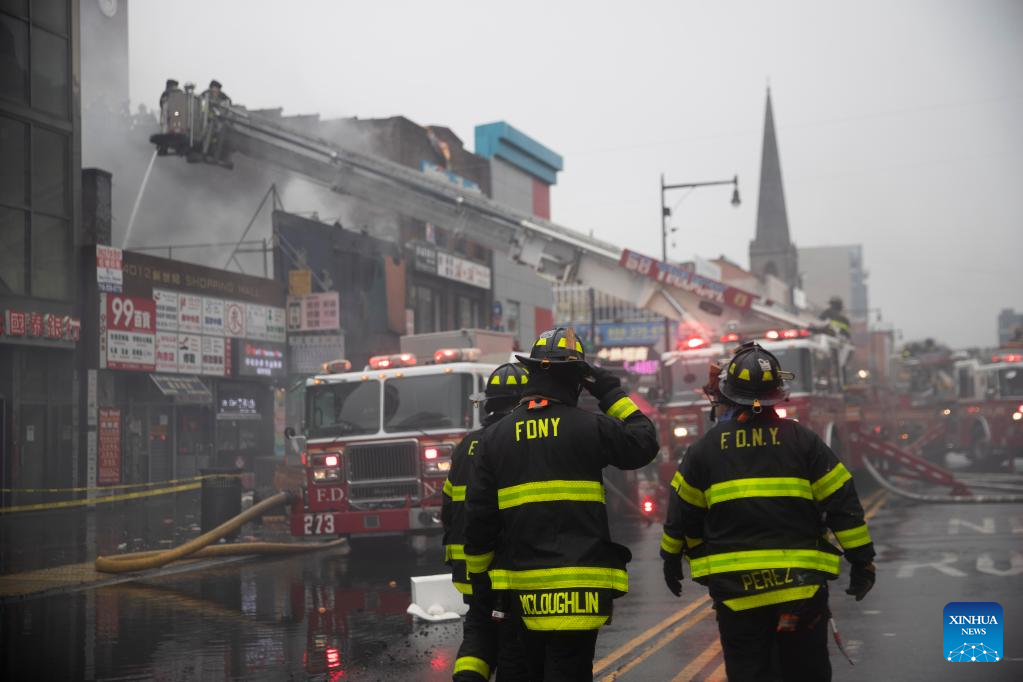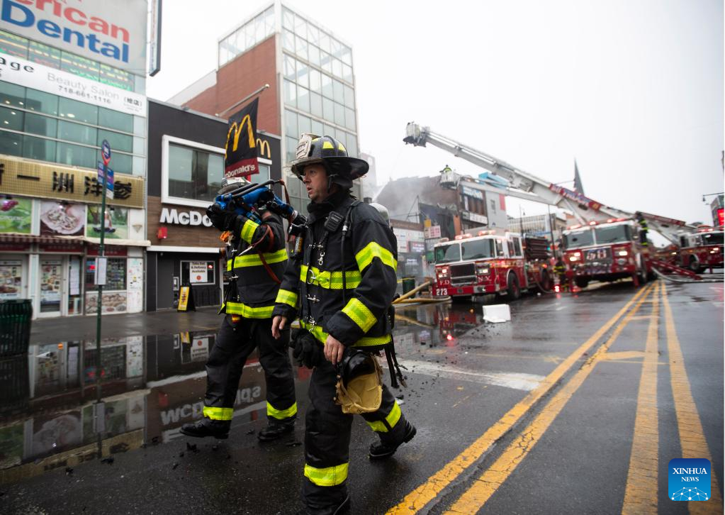 Fire fighters work at the fire site in Flushing of New York, the United States, March 17, 2022. A commercial building in Flushing Chinatown of New York City suffered serious damage from a 5-alarm fire on Thursday morning. (Xinhua/Wang Ying)