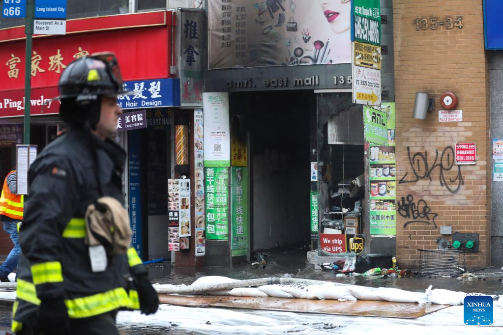 A fire fighter walks past a store damaged by the fire in Flushing of New York, the United States, March 17, 2022. A commercial building in Flushing Chinatown of New York City suffered serious damage from a 5-alarm fire on Thursday morning. (Xinhua/Wang Ying)