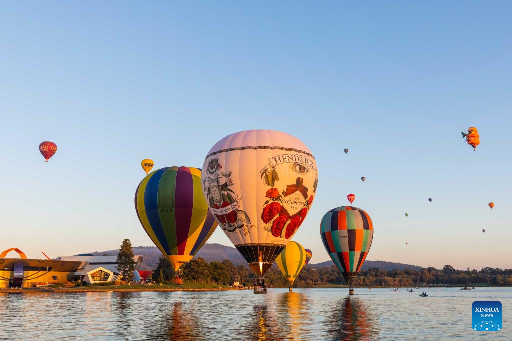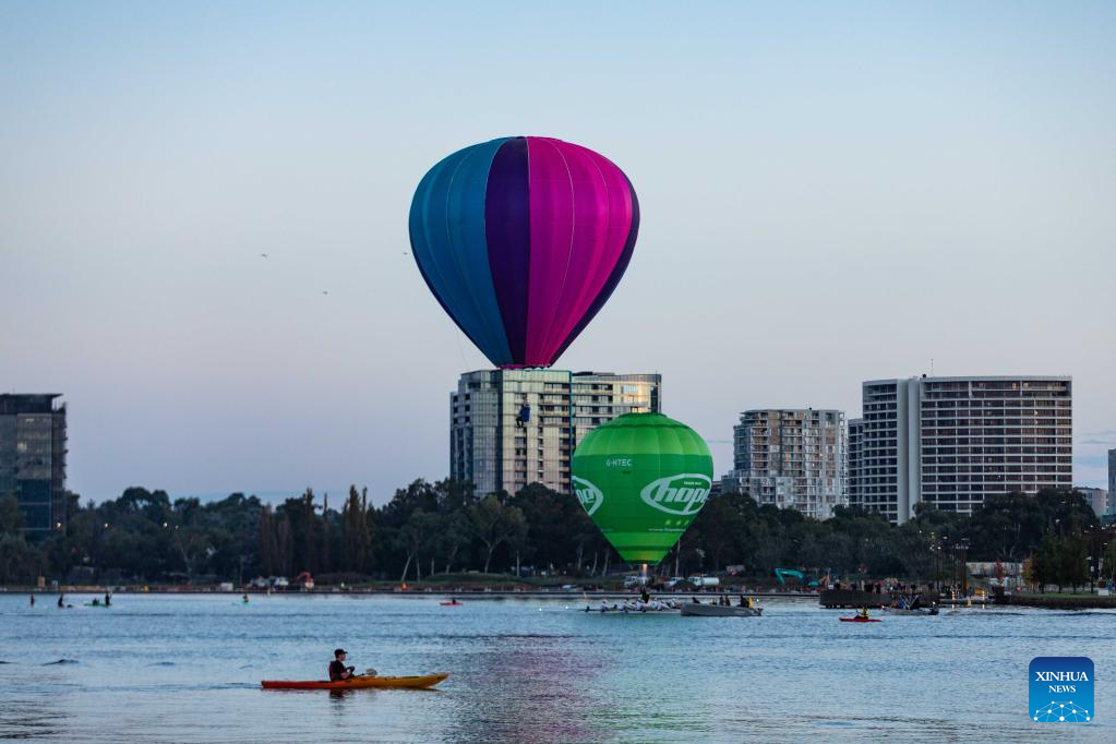 Hot air balloons are seen during the annual Canberra Balloon Spectacular festival in Canberra, Australia, March 18, 2022. The annual Canberra Balloon Spectacular festival, a hot air balloon festival celebrated in Australia's capital city, is held this year from March 12 to 20. (Photo by Chu Chen/Xinhua)