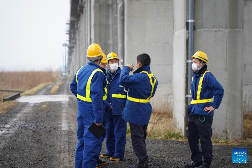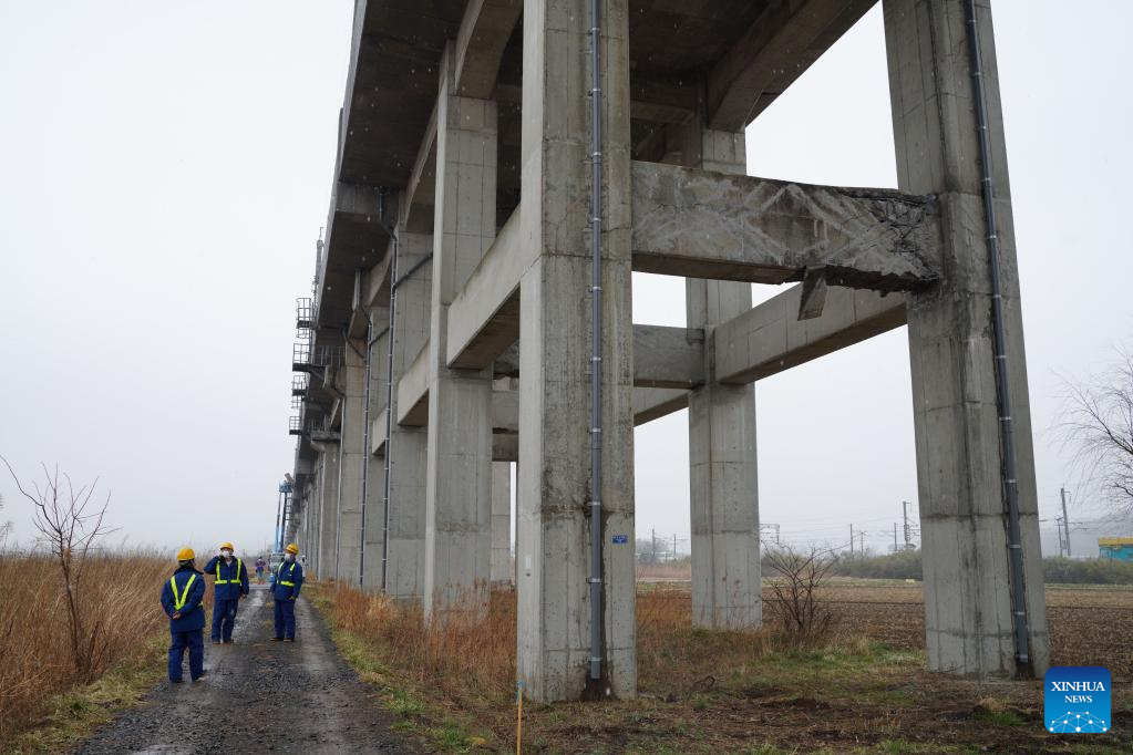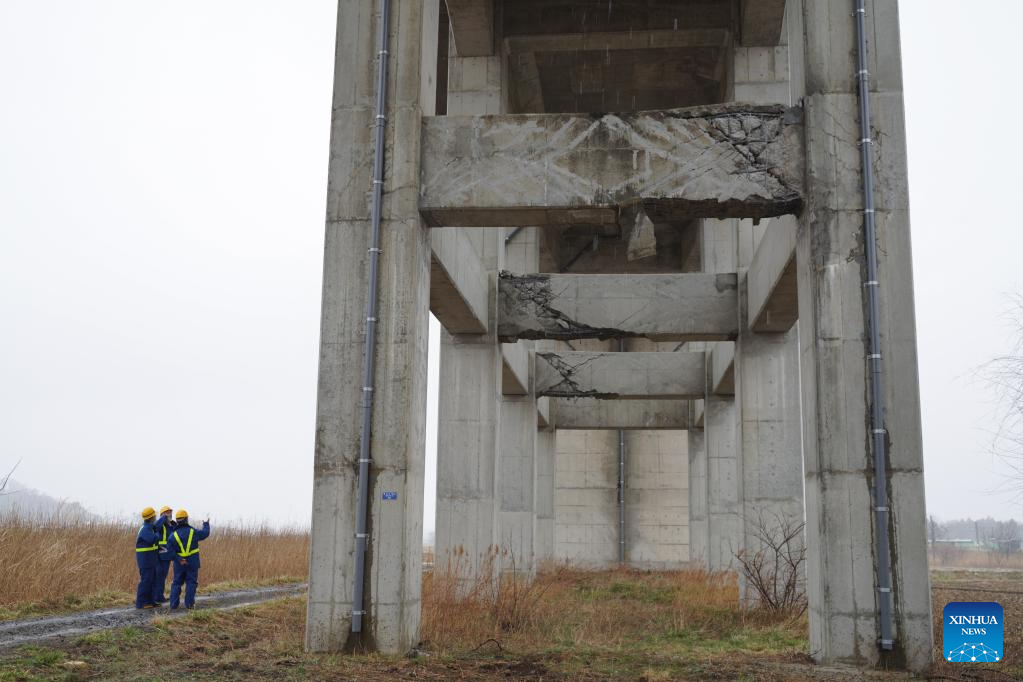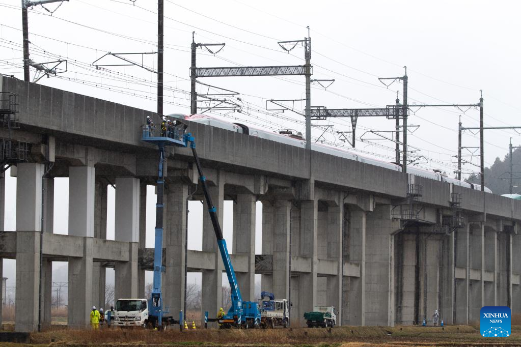 Staff members maintain damaged facilities after an earthquake in Shiroishi City of Miyagi Prefecture, Japan, March 18, 2022. Part of the Tohoku Shinkansen bullet train service was suspended Thursday morning after the earthquake derailed a train between Fukushima Station and Shiroishizao Station, but all 78 passengers and crew members aboard were not injured, according to East Japan Railway Company. (Xinhua/Zhang Xiaoyu)