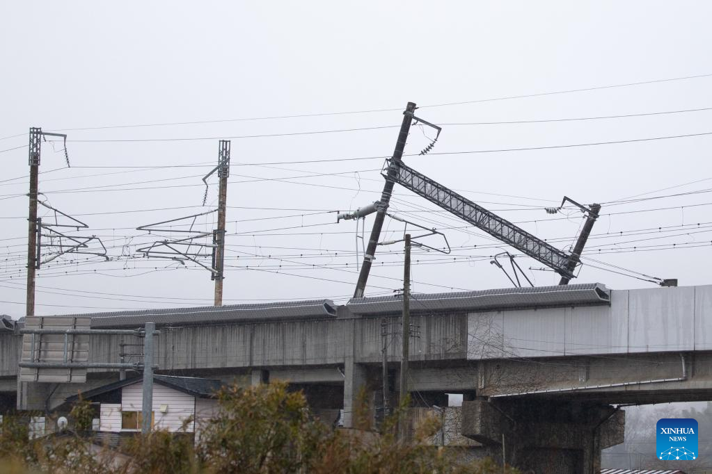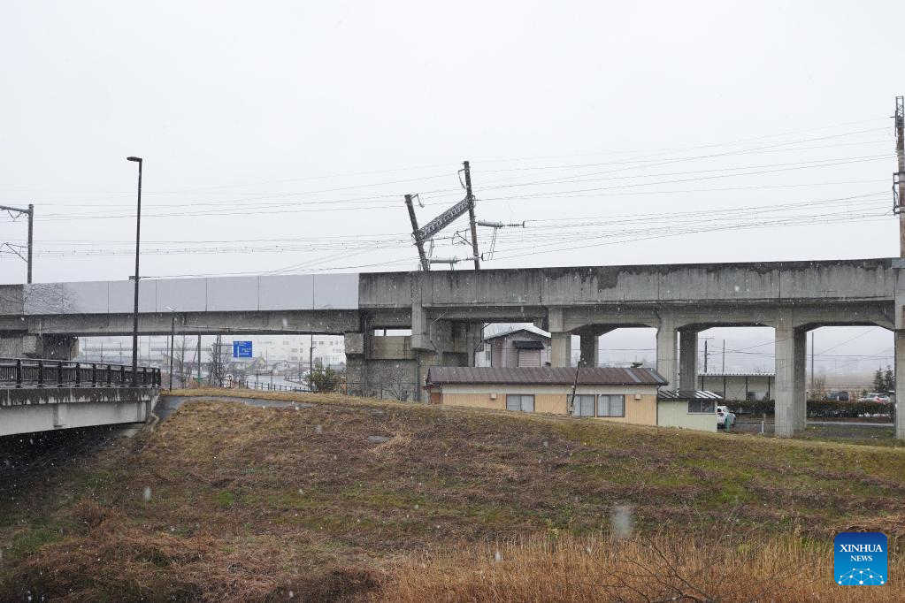 Photo taken on March 18, 2022 shows an inclined utility pole after an earthquake in Shiroishi City of Miyagi Prefecture, Japan, Part of the Tohoku Shinkansen bullet train service was suspended Thursday morning after the earthquake derailed a train between Fukushima Station and Shiroishizao Station, but all 78 passengers and crew members aboard were not injured, according to East Japan Railway Company. (Xinhua/Zhang Xiaoyu)