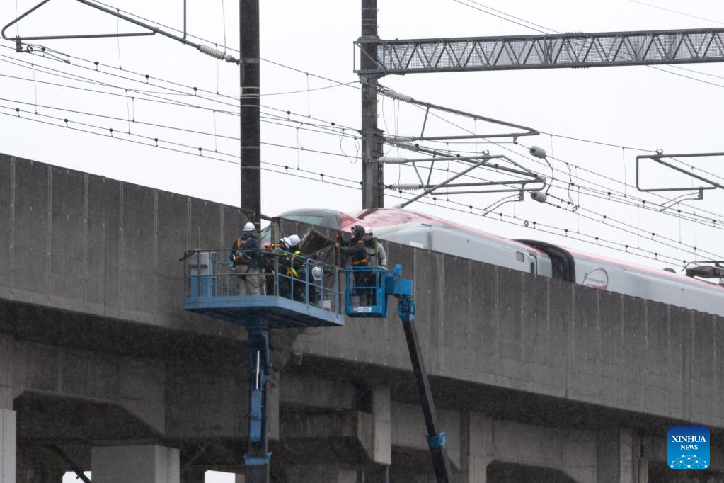 A derailed Shinkansen bullet train is pictured after an earthquake in Shiroishi City of Miyagi Prefecture, Japan, March 18, 2022. Part of the Tohoku Shinkansen bullet train service was suspended Thursday morning after the earthquake derailed a train between Fukushima Station and Shiroishizao Station, but all 78 passengers and crew members aboard were not injured, according to East Japan Railway Company. (Xinhua/Zhang Xiaoyu)