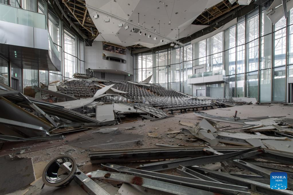 Photo taken on March 18, 2022 shows a damaged building after an earthquake in Shiroishi City of Miyagi Prefecture, Japan. (Xinhua/Zhang Xiaoyu)