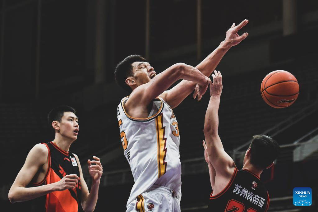 Ge Zhaobao (C) of Shanxi Loongs is defended during the 36th round match between Jiangsu Dragons and Shanxi Loongs at the 2021-2022 season of the Chinese Basketball Association (CBA) league in Shenyang of northeast China's Liaoning Province, March 18, 2022. (Xinhua/Wang Yijie)