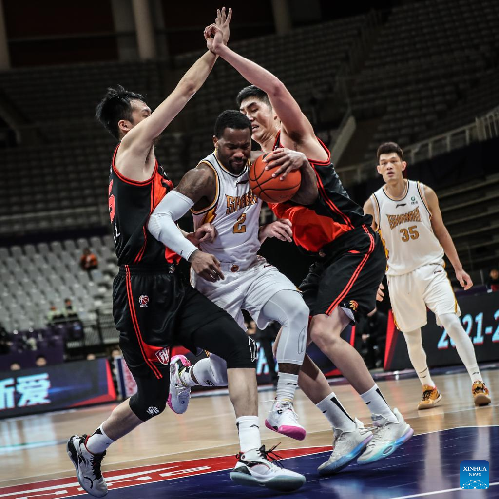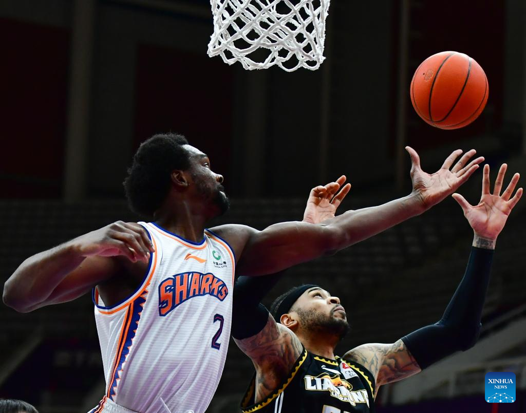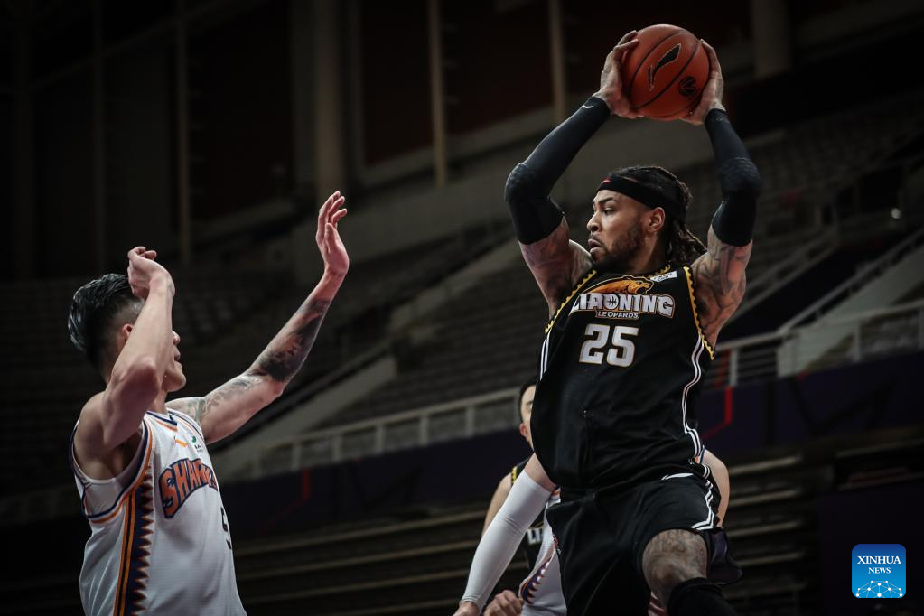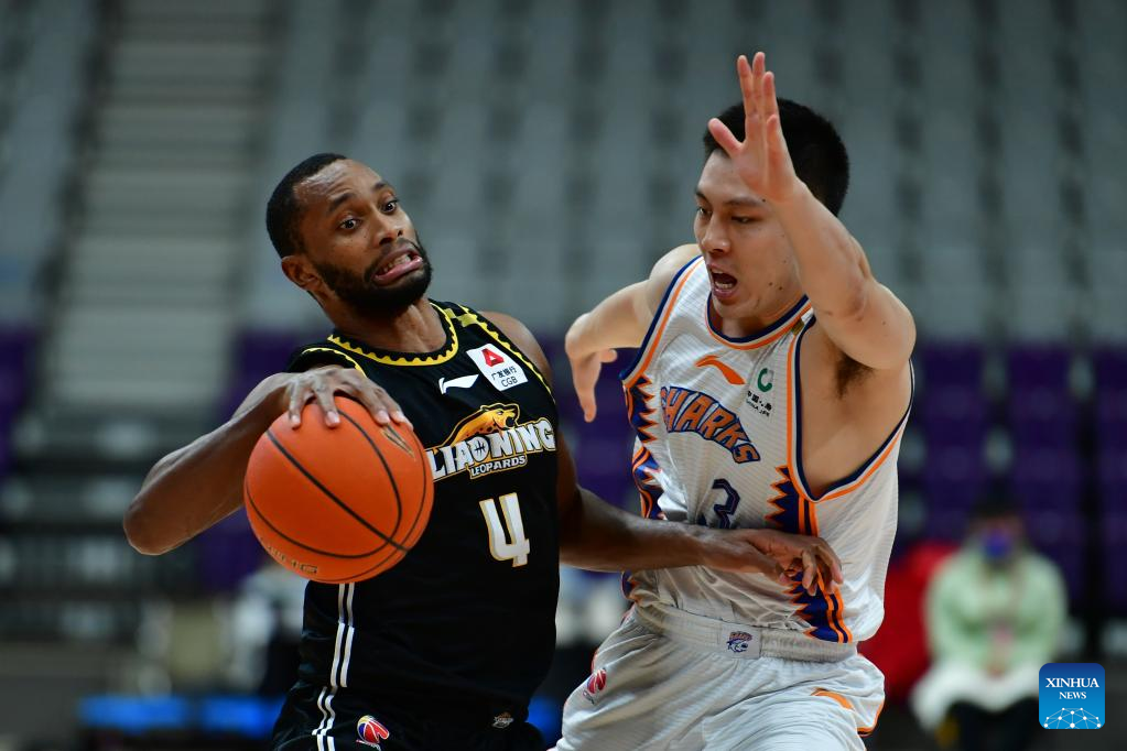 Eric Moreland (R) of Liaoning Flying Leopards competes during the 36th round match between Shanghai Sharks and Liaoning Flying Leopards at the 2021-2022 season of the Chinese Basketball Association (CBA) league in Shenyang of northeast China's Liaoning Province, March 18, 2022. (Xinhua/Pan Yulong)