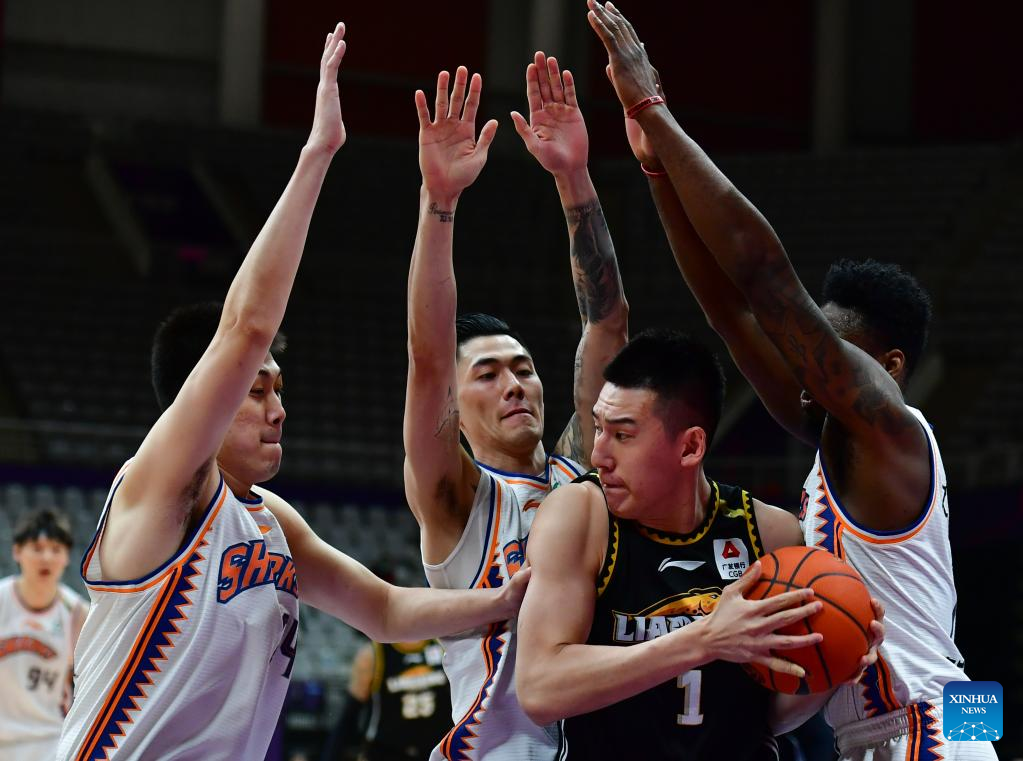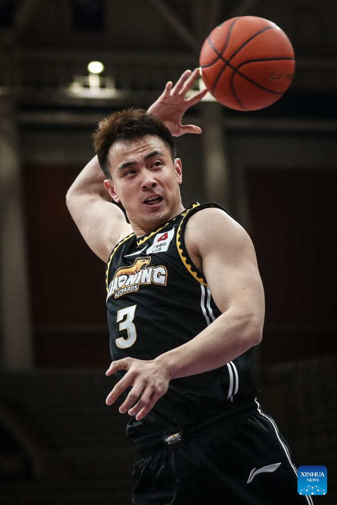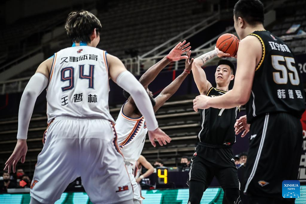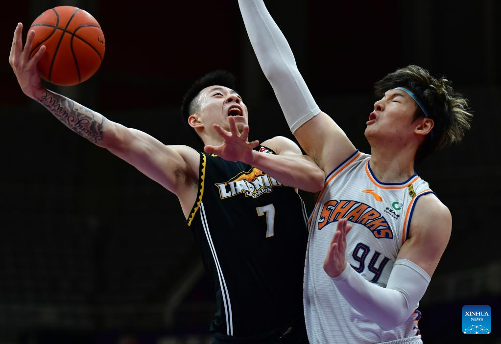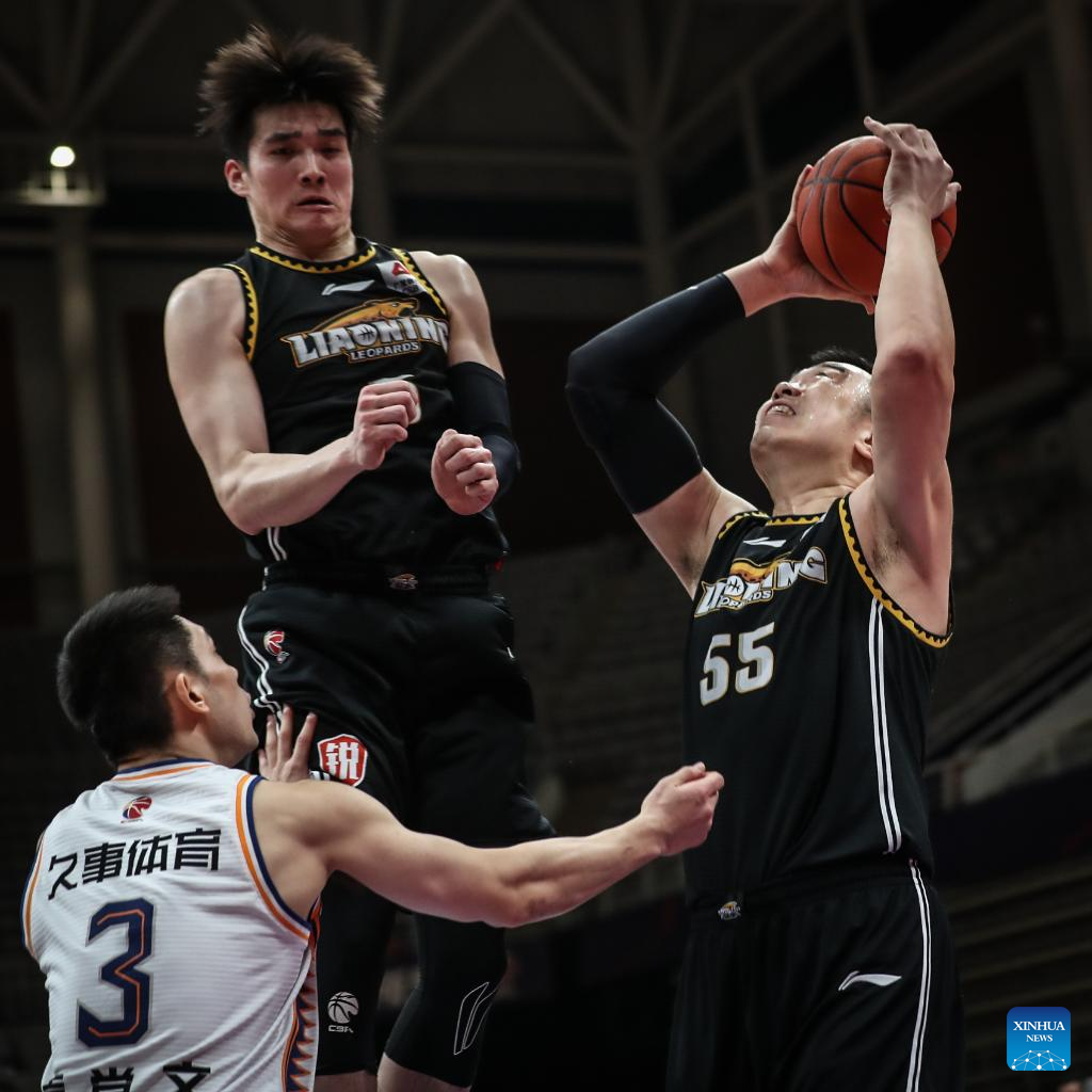 Fu Hao (2nd R) of Liaoning Flying Leopards competes during the 36th round match between Shanghai Sharks and Liaoning Flying Leopards at the 2021-2022 season of the Chinese Basketball Association (CBA) league in Shenyang of northeast China's Liaoning Province, March 18, 2022. (Xinhua/Wang Yijie)