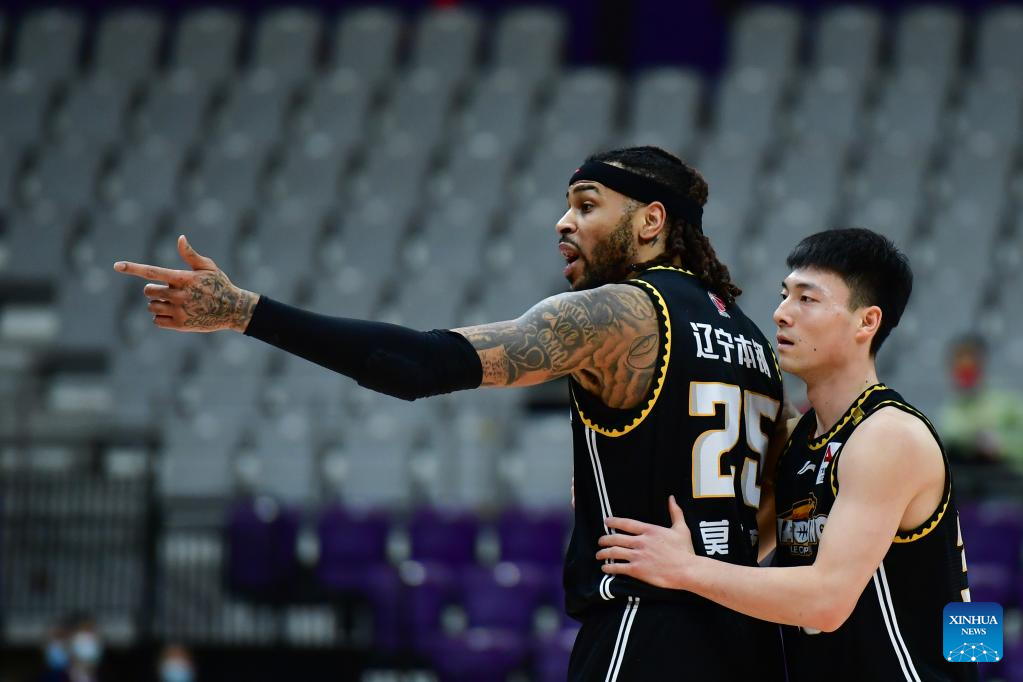 Eric Moreland (L) of Liaoning Flying Leopards reacts during the 36th round match between Shanghai Sharks and Liaoning Flying Leopards at the 2021-2022 season of the Chinese Basketball Association (CBA) league in Shenyang of northeast China's Liaoning Province, March 18, 2022. (Xinhua/Wang Yijie)