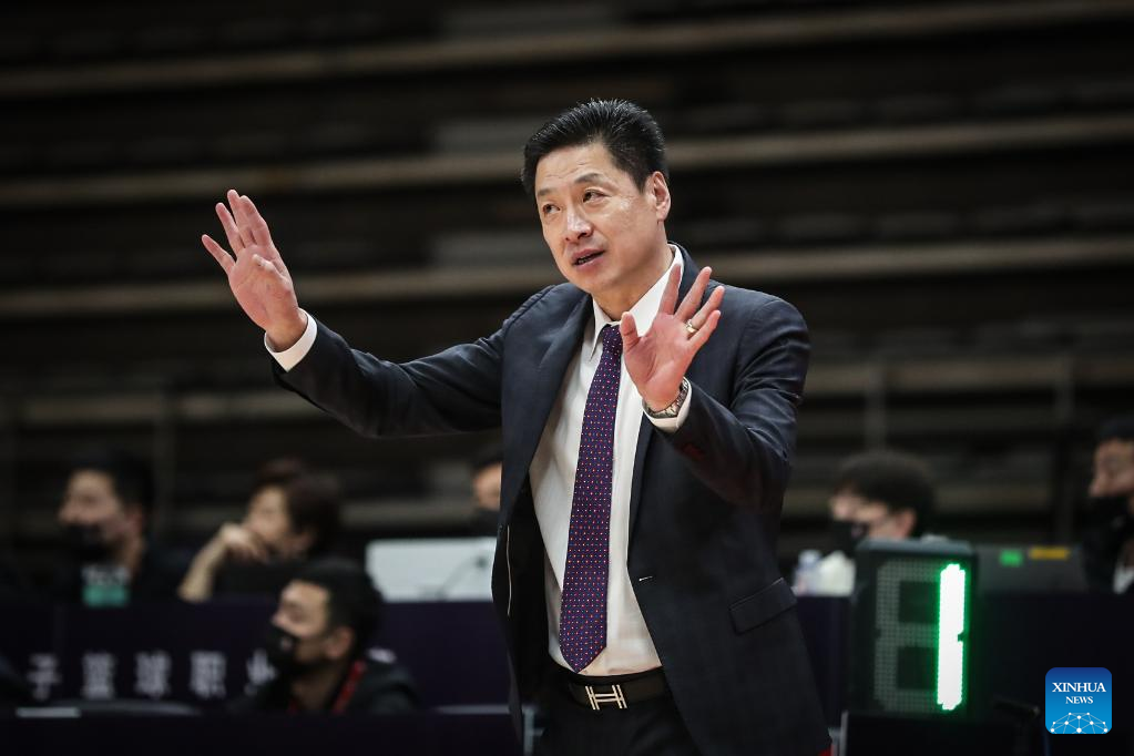 Li Chunjiang, head coach of Shanghai Sharks, reacts during the 36th round match between Shanghai Sharks and Liaoning Flying Leopards at the 2021-2022 season of the Chinese Basketball Association (CBA) league in Shenyang of northeast China's Liaoning Province, March 18, 2022. (Xinhua/Pan Yulong)
