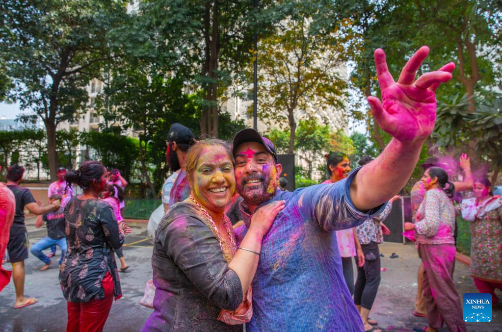 People smeared in colored powder celebrate Holi, the festival of colors, in New Delhi, India, March 18, 2022. (Xinhua/Javed Dar)