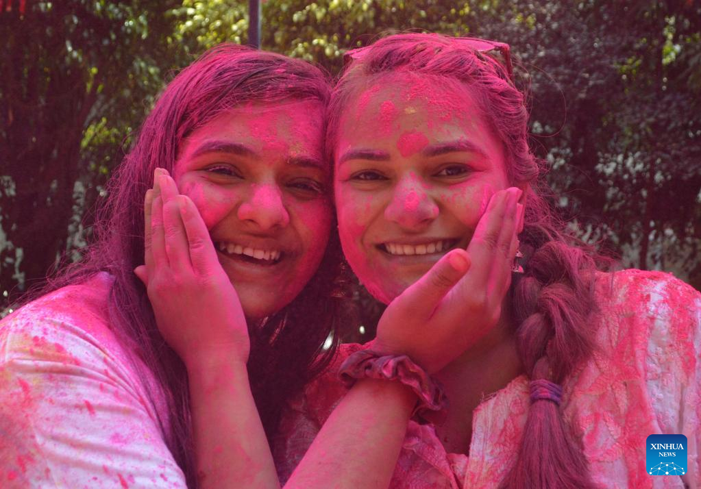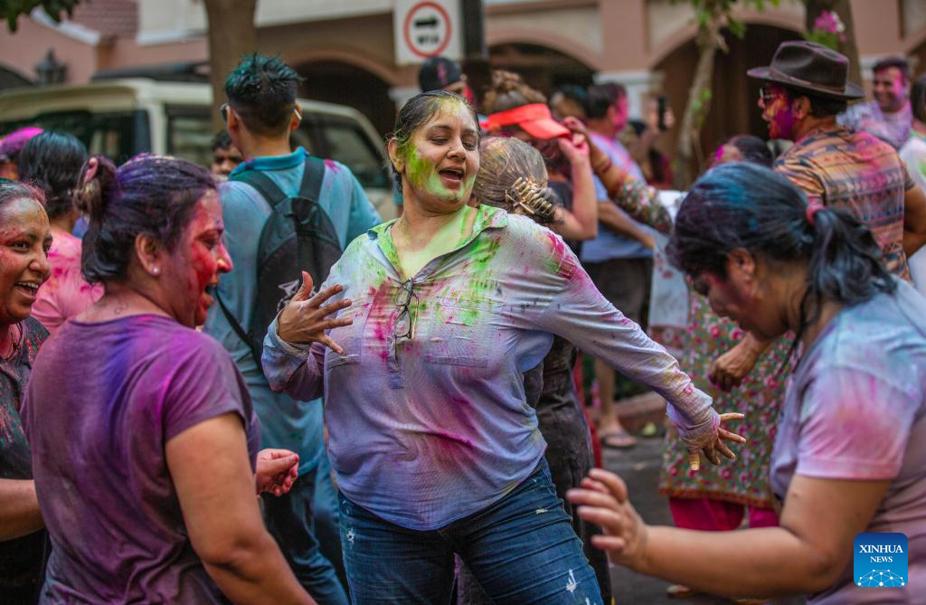 People celebrate Holi, the festival of colors, in Kathmandu, Nepal, March 17, 2022. (Photo by Sulav Shrestha/Xinhua)