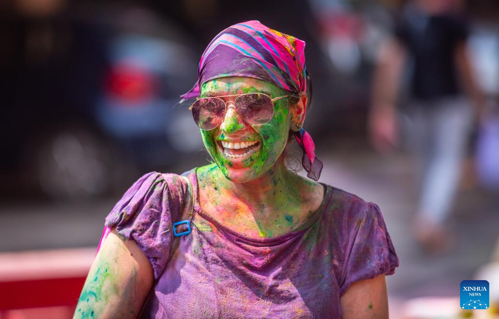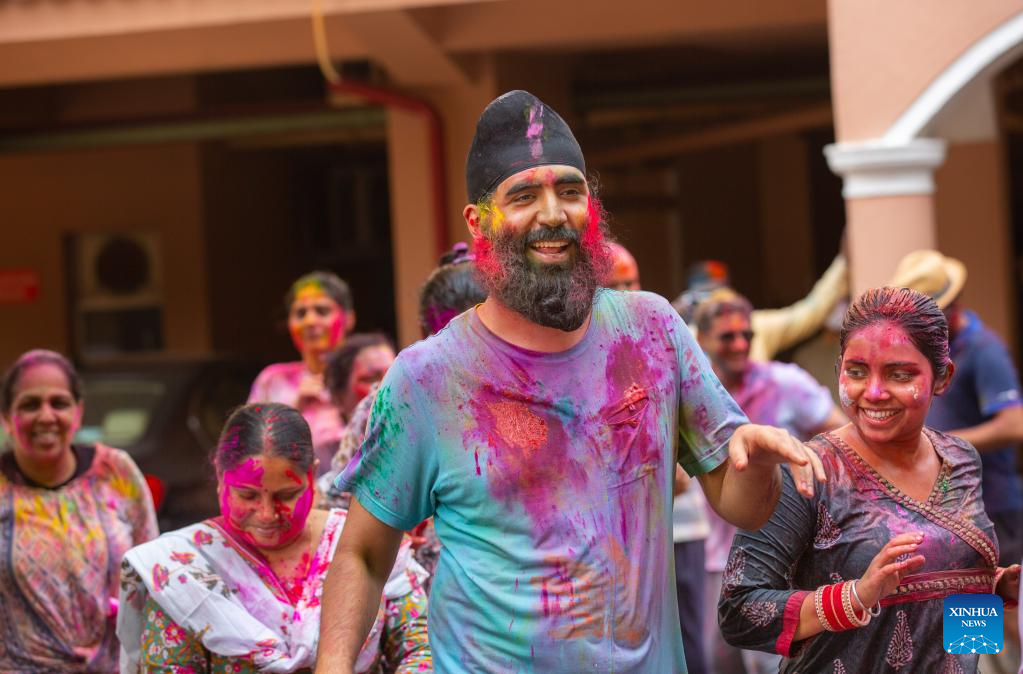 People participate in celebrations of Holi festival, the festival of colors, in Karachi, Pakistan, on March 17, 2022. (Str/Xinhua)