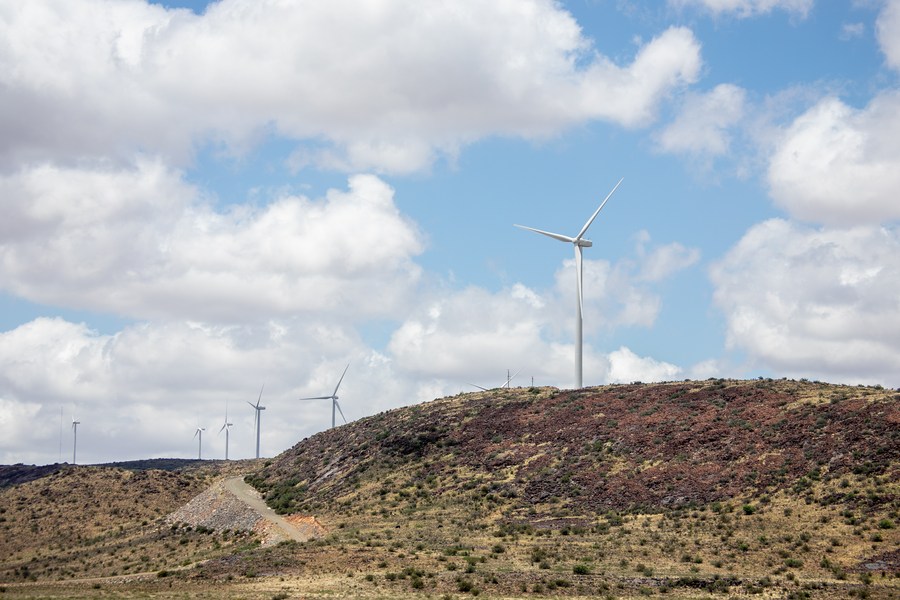 Photo taken on Nov. 22, 2021 shows wind turbines of the De Aar wind power project invested by China's Longyuan Power and its South African partners in De Aar, South Africa. (Xinhua/Lyu Tianran)