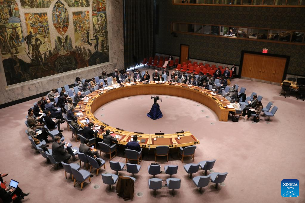 Photo taken on March 18, 2022 shows a Security Council meeting on the biological security issue in Ukraine at the UN headquarters in New York. Zhang Jun, China's permanent representative to the United Nations, on Friday asked relevant parties to the biological security issue in Ukraine to respond to newly discovered documents and offer clarifications to remove the doubts of the international community. (Xinhua/Xie E)