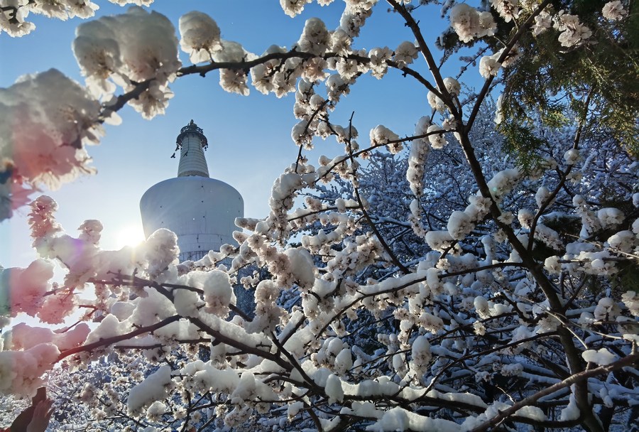 Photo taken with a mobile phone shows the snow scenery at Beihai Park in Beijing, capital of China, March 19, 2022. (Xinhua/Luo Xiaoguang)