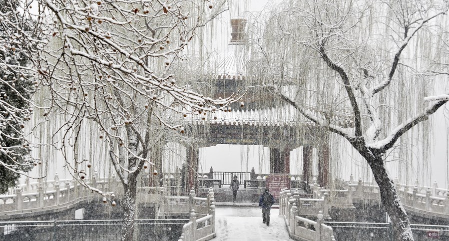 People enjoy snow view at a park in Beijing, capital of China, March 18, 2022. (Xinhua/Li Xin)