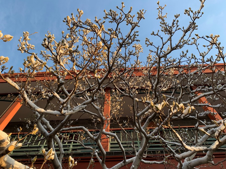 Photo taken with mobile phone on March 19, 2022 shows the snowy scenery at Zhongshan Park in Beijing, capital of China. (Xinhua/Zhang Chuanqi)