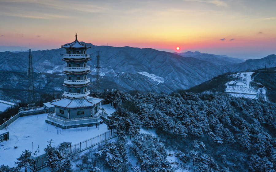 Aerial photo taken on March 19, 2022 shows the snow scenery at a forest farm in Beijing, capital of China. (Xinhua/Li He)